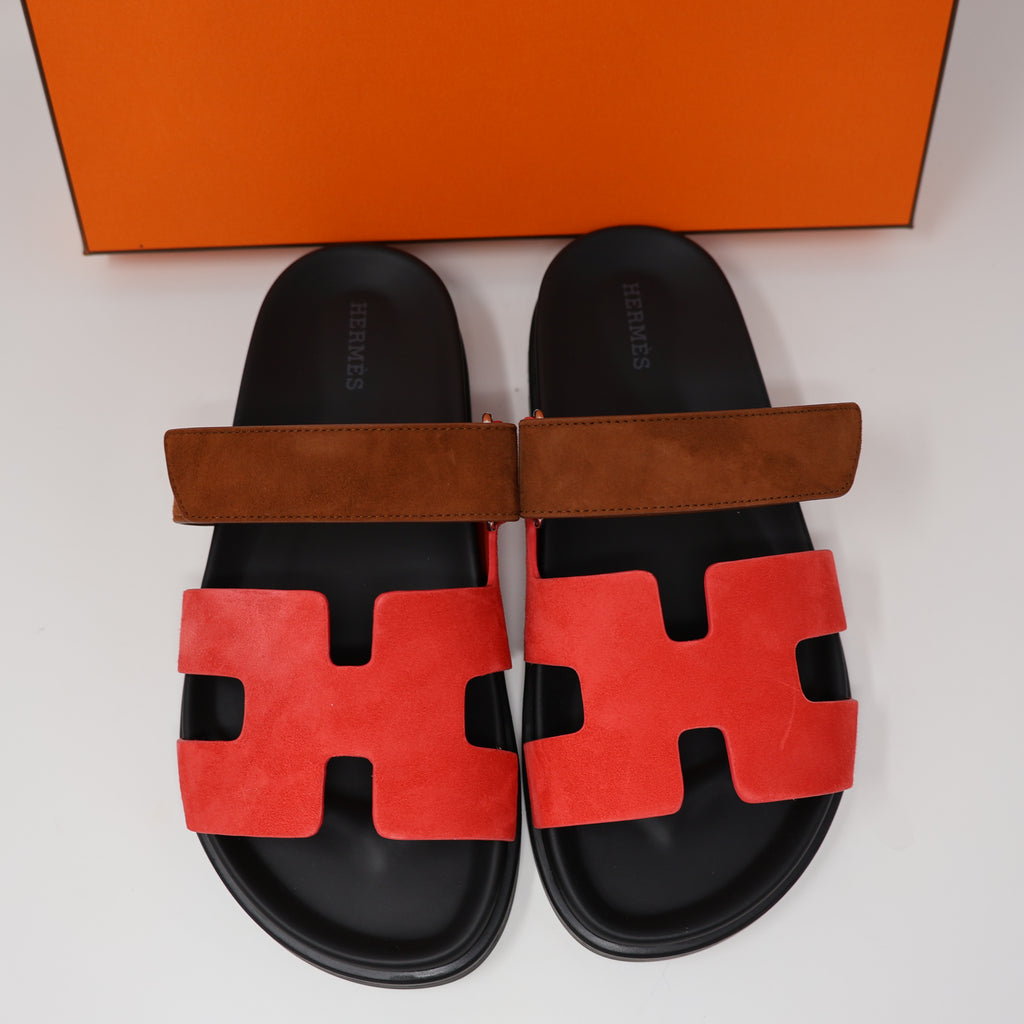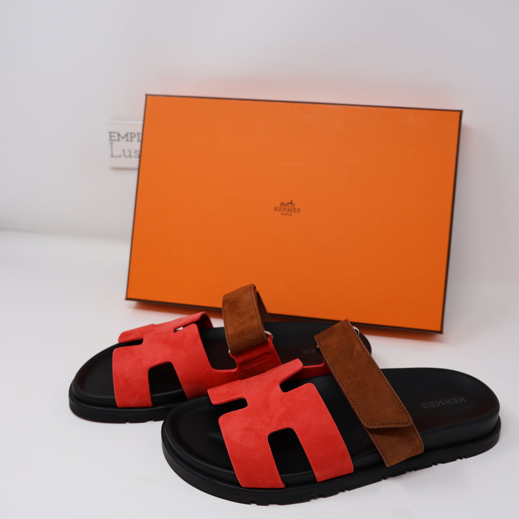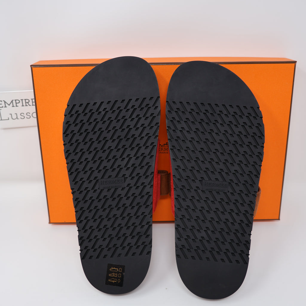 37 NEW HERMES WOMEN CHYPRE SANDALS SLIPPERS Rouge Cinetique Gold Suede