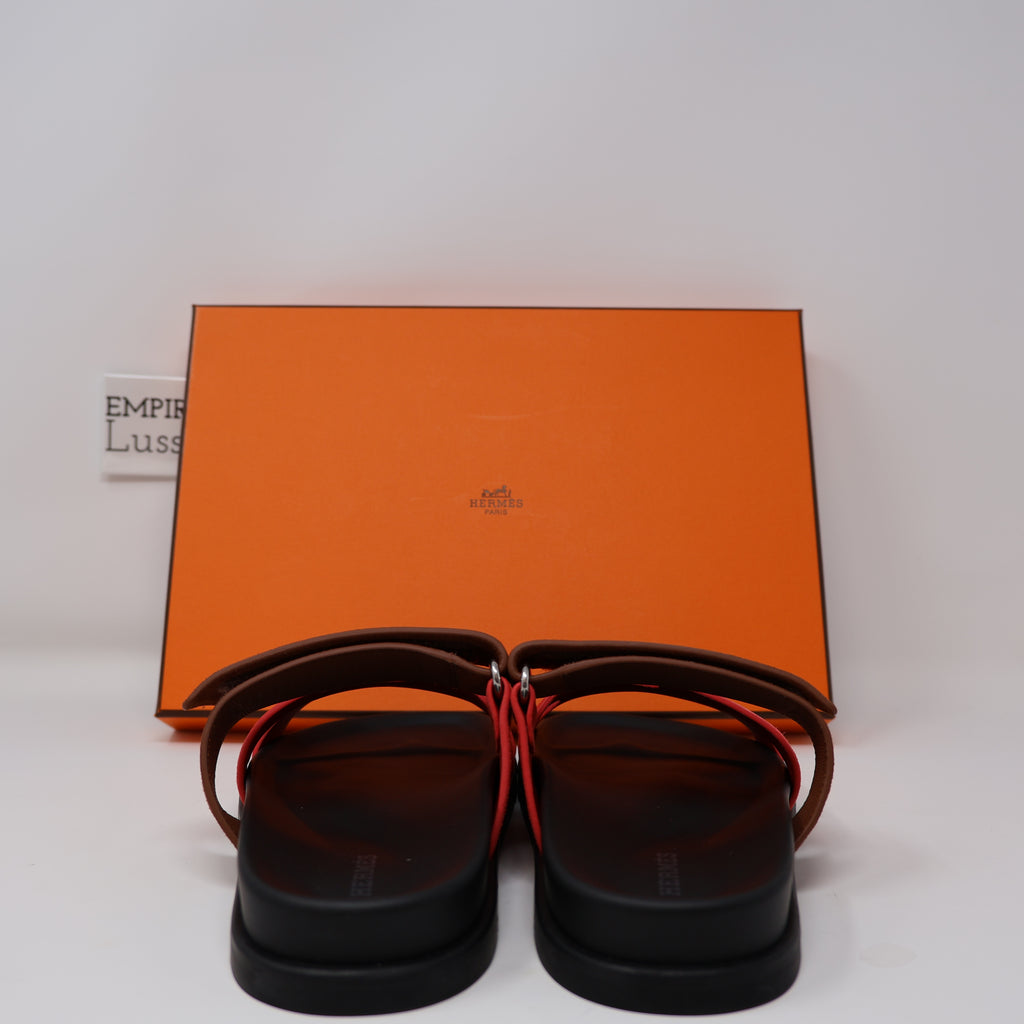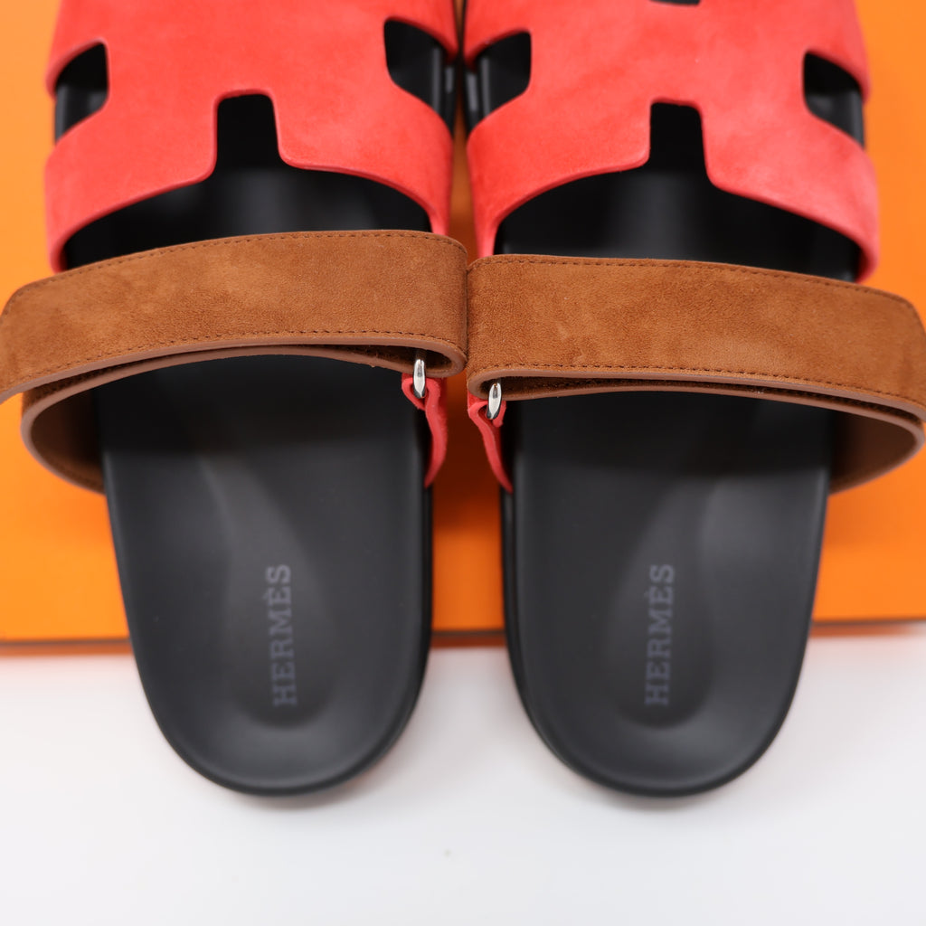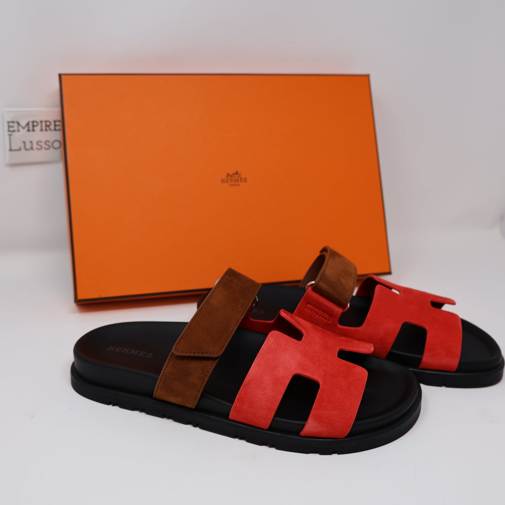 37 NEW HERMES WOMEN CHYPRE SANDALS SLIPPERS Rouge Cinetique Gold Suede